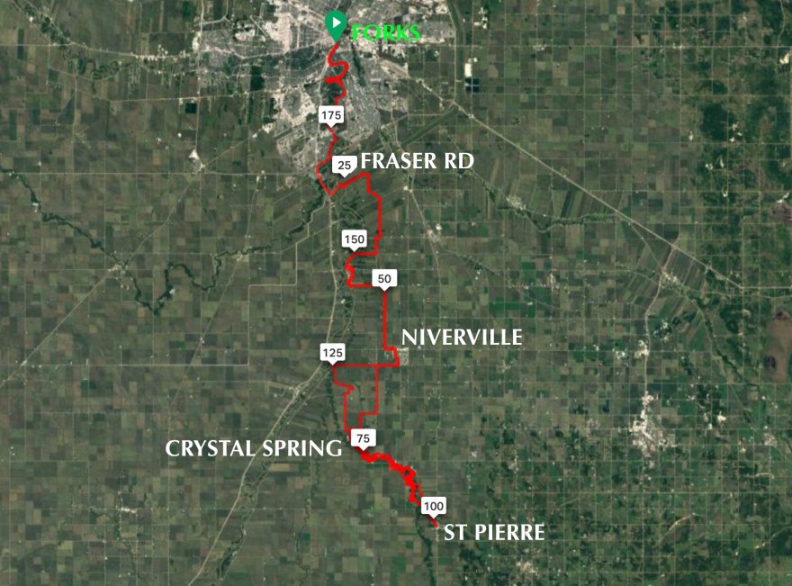 So, this year we’ll be doing an out-and-back event starting and finishing at the Forks. The longest distance cyclists and runners will turn around at St Pierre and Crystal Spring respectively, spots our return participants will be familiar with. The classic distance turn around will be Niverville, another location we’ve used for years, and the shorter distance turn around will be a new checkpoint on Frasier Road just east of St Mary’s and just north of the Floodway. We’ll still be following the Crow Wing Trail for much of the race as in years past, and will keep total distances and finish times similar to previous years. For the longest distance cyclists we’ve substituted the interesting terrain around the Senkiw suspension bridge with a ride on the Rat River between Crystal Spring and St Pierre (assuming favourable conditions of course). We hope to expose the longest distance runners to a part of the Rat River as well.